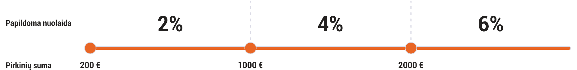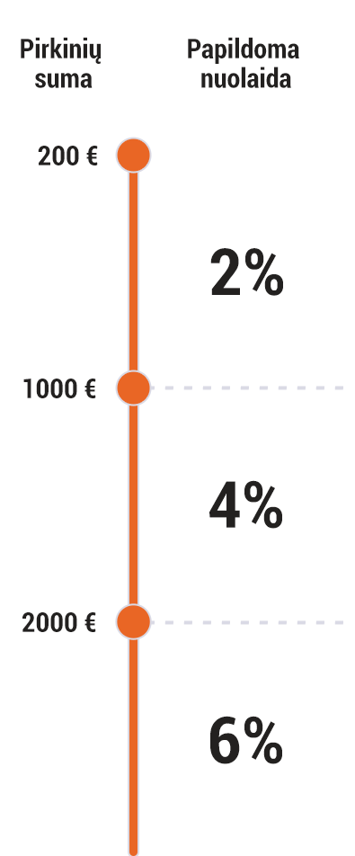 Kiekvienas nuolaidų lygis priklauso nuo ankstesnių pirkimų sumos. Pirmasis nuolaidų lygis klientui priklauso įsigijus prekių už min. 200 EUR, o nuolaidos vertė tokiu atveju siekia 2%. Sekantis nuolaidų lygis tai 4% nuolaida išleidus 1000 EUR, o toliau net 6% nuolaida apsipirkus už 2000 EUR.